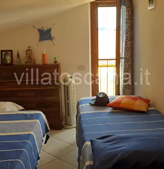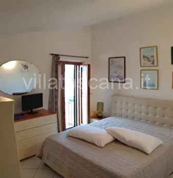 Capalbio vista mare al primo piano di piccolo condominio vendesi appartamento di 82 metri quadrati composto da soggiorno con angolo cottura e camino, disimpegno, due camere matrimoniali, due bagni di cui uno in camera, completano la proprietà un b...