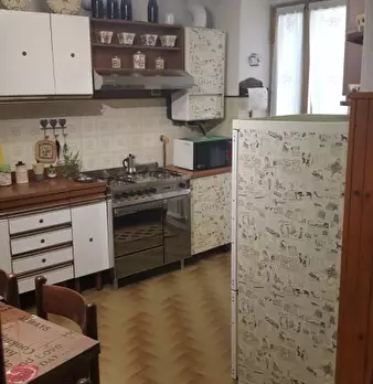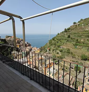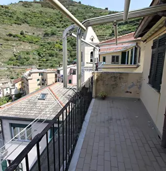 5 Terre, al centro di Riomaggiore, in tipica costruzione ligure, al primo piano, stupendo 3 vani con grande terrazza e poggiolo, composto da poggiolo, ingresso in cucina, camera matrimoniale con accesso alla terrazza, sala o 2° camera sempre con a...