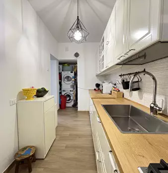 Ingresso su corridoio, due camere da letto, di cui una di 25Mq, un ripostiglio grande con capienza armadio a 6 ante, 1 bagno + antibagno con lavabi, cucina e soggiorno grandi più un cucinotto all'esterno e un salone. Tutta con parquet in Teak, por...
