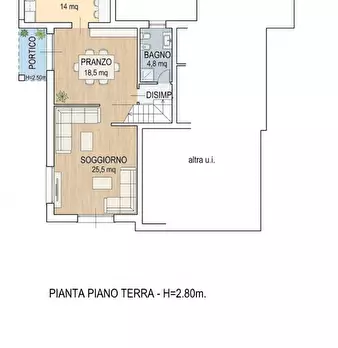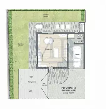 Porzione di Bifamiliare in orizzontale con ingresso e giardino privato. L’abitazione si sviluppa su 2 piani, al piano terra troviamo l’ingresso principale, il garage, un bagno/lavanderia, una taverna/studio ideale per essere usata sia per il lavor...