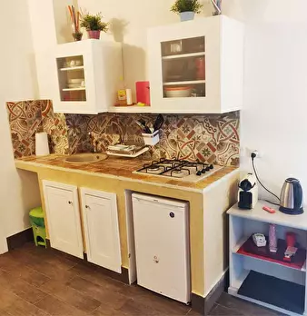 La casa ha un unico ambiente cucina soggiorno al piano terra, che viene diviso nella zona living, con tavolino e sedute, e nella zona cucina, con piano induzione e frigorifero e lavabo. Al piano soppalcato, raggiungibile con scala in ferro ed es...