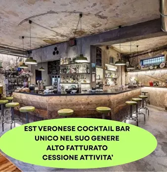 San Bonifacio proponiamo avviato Cocktail Bar Pub in posizione centrale punto di riferimento da anni per tantissimi giovani .Locale unico nel suo genere sviluppato su una superficie di 120 mq , 50 posti interni , 50 esterni Fatturato interessante ...