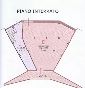 Magazzino con accesso carraio posto al piano seminterrato di circa 140 mq. con possibilità di accesso ad autoveicoli. L'immobile è dotato di impianto elettrico