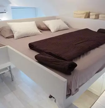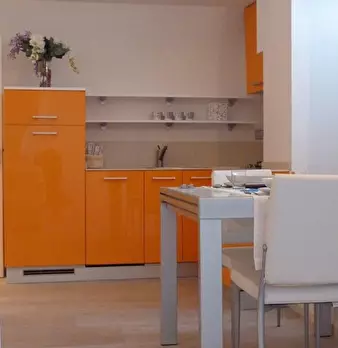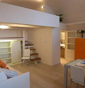 Miniappartamento composto da soggiorno, cucinino, bagno, soppalco con letto matrimoniale e letto singolo, terrazzo, giardino, posto auto coperto e cantina. Termo autonomo.