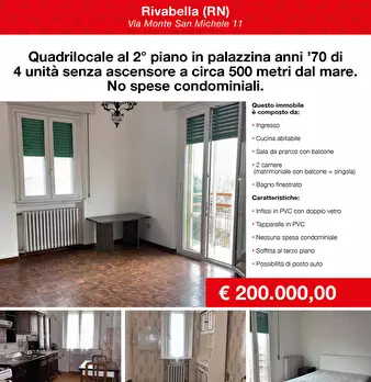 QUADRILOCALE IN VENDITA – RIVABELLA (RN) Via Monte San Michele 11 - A soli 500 metri dal mareProponiamo quadrilocale al secondo piano in palazzina degli anni '70 di sole 4 unità,- senza amministratore;- senza spese condominiali;- possibilità di po...