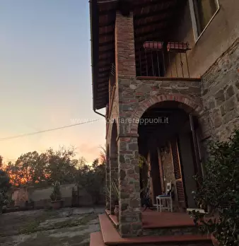 Lucignano vendesi casale in pietra e mattoni in posizione panoramica su due livelli composta al piano terra da centrale termica, forno, cantina, bagno, disimpegno, dispensa,cucina, soggiorno ampio e camera; al piano primo da loggiato, studio, 3 ba...