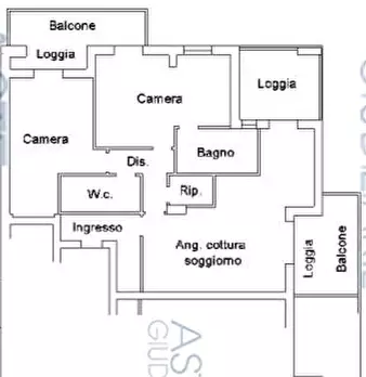 Vendesi in Asta a Gaiofana di Rimini, Appartamento al piano secondo, composto da ingresso, soggiorno con angolo cottura, disimpegno, ripostiglio, bagno, camera, camera con bagno, due logge, veranda (da ripristinare a loggia) e due balconi; - una a...