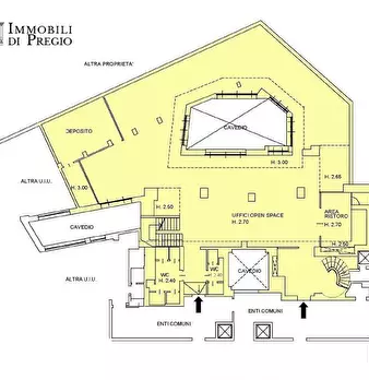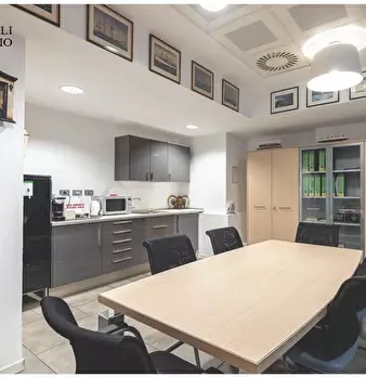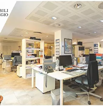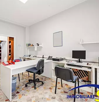Il piano rialzato è composto da doppio ingresso, ampia sala d'attesa, due grandi uffici open-space, quattro uffici, una sala riunioni, un locale rack e quattro bagni. Il piano seminterrato, collegato internamente da due bellissimi vani scala, è co...
