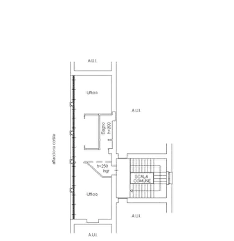 ufficio al piano primo composto otto locali , corridoio, due nuclei di servizi igienici ciascuno costituito da antibagno e due w.c., area pertinenziale di parcheggio per due posti auto in piano terreno e area pertinenziale residuale verde in piano...